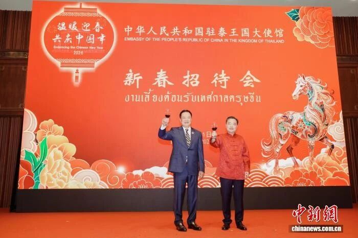近日,中国驻泰国大使张建卫偕夫人苗海燕在使馆举办2026年“温暖迎春共庆中国年”新春招待会,泰国总理阿努廷及夫人、在泰华侨华人、中资机构人员、留学生代表等700余人出席。活动现场红灯高挂、彩饰缤纷。张建卫大使与阿努廷总理共同为瑞狮点睛,拉开新春庆典序幕。